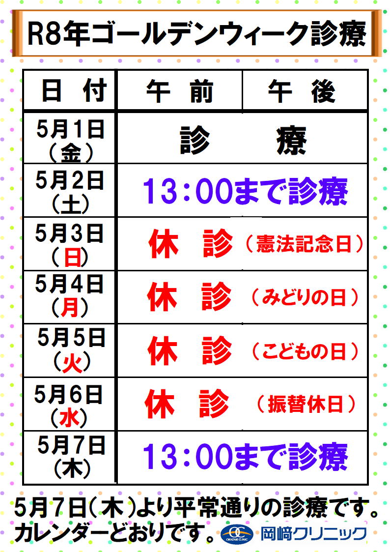 休診日は、日曜・祝日・盆(8/13~15)・年末年始(12/30~1/3)